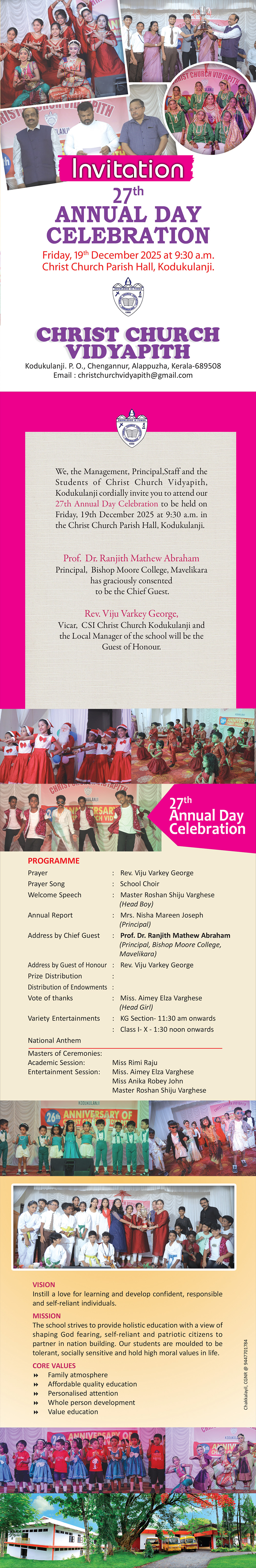 Christ Church Vidyapith is a CBSE affiliated Secondary School located at Kodukulanji in the Kollam-Theni highway.Kodukulanji is in Chengannur taluk of Allapuzha district in Kerala.